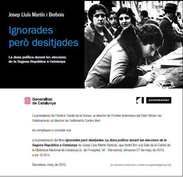 – A càrrec de l’historiador Josep Lluís Martín i Berbois, i en la que intervindran la presidenta de l’Institut Català de la Dones, el director de l’Entitat Autònoma del Diari Oficial i de Publicacions i el director de l’editorial A Contra Vent.