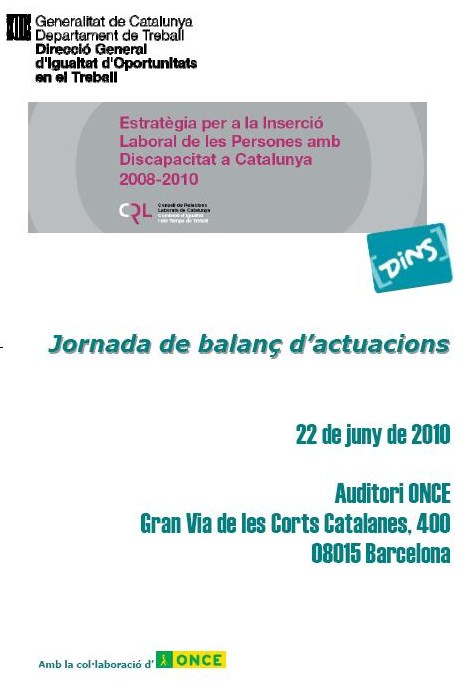 El Departament de Treball us convida a assistir el proper dia 22 de juny a la jornada de presentació del balanç de l’Estratègia per a la inserció laboral de les persones amb discapacitat a Catalunya 2008-2010, en el transcurs de la qual es farà entrega del Premi DINS a la investigació per a la inserció laboral de persones amb discapacitat o malaltia mental.