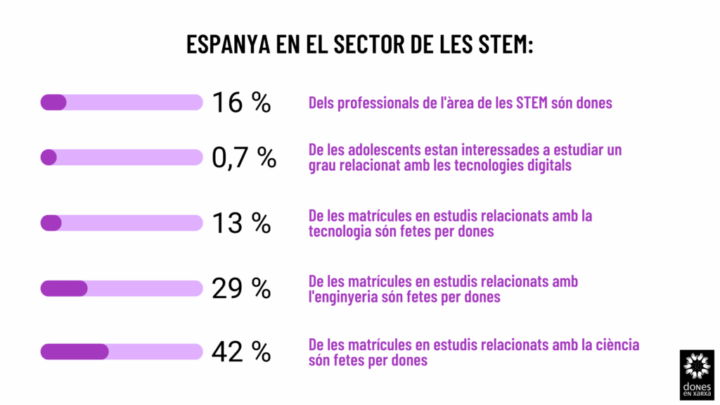 L’estudi destaca que molt poques adolescents, el 0,7%, estan interessades a estudiar un grau relacionat amb les tecnologies digitals, enfront del 7% dels homes. Per això, resulta fonamental vincular a les dones a les STEM des dels primers cursos de l’etapa escolar, ja que la bretxa en general és molt marcada, sobretot per als estudis relacionats amb la tecnologia (13% de dones matriculades, enfront del 87% d’homes) i l’enginyeria (29% i 71%, respectivament). En el cas de les matemàtiques, cada vegada són menys les dones matriculades. Per a les ciències, s’observa que la proporció de dones matriculades és també menor, en concret, del 42% enfront del 58% d’homes, essent les ciències de la vida l’única excepció (59% de dones i 41% d’homes).