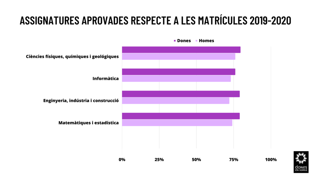 L’estudi també destaca que el rendiment de les dones en carreres de l’àrea de les STEM, mesurat com el percentatge d’assignatures aprovades respecte a les matriculades, és major que el dels homes.