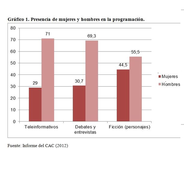 L’últim informe del Consell de l’Audiovisual de Catalunya (CAC) sobre la representació de les dones en la televisió proporciona dades valuosos i prou amplis per mostrar de forma empírica aquestes dimensions. Analitza els informatius, els debats i entrevistes, i els programes de ficció (de producció pròpia) emesos durant el primer semestre de l’ any 2012 per quatre televisions: TV3 (pública autonòmica), TVE a Catalunya (desconnexions de la cadena estatal), 8tv (privada autonòmica) i BTV (pública local de Barcelona) . Això ha implicat analitzar 4.431 unitats de notícies , 2.690 intervencions en debats o entrevistes i 357 personatges de ficció .