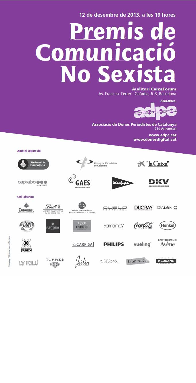 L’acte de lliurament dels Premis de Comunicació no Sexista, que atorga l’Associació de Dones Periodistes de Catalunya (ADPC), tindrà lloc el proper 12 de Desembre a les 19.00h i aquest any serà en un nou escenari: l’Auditori del CaixaFòrum.