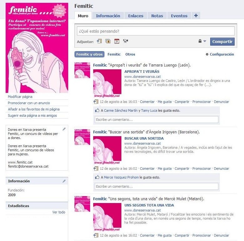 El concurs de vídeos realitzats per dones de Dones en Xarxa, Femitic, continua sumant adeptes. A Facebook, la xarxa social per excel·lència, la seva pàgina oficial ja acumula la quantitat de 1.131 admiradors i admiradores. I aquest nombre segueix creixent dia a dia.