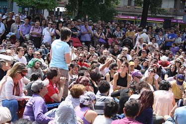 El paisatge humà era commovedor. Milers de persones, diverses assegudes per seguir amb atenció l’assemblea general de Sol, que en aquesta ocasió era també l’avantsala del desplegament als barris programat per al dia següent. Es respirava calma i respecte. Podien sentir-se les bombolles d’alegria i esperança que planejaven la plaça com una suau carícia des del futur. L’ombra del que va passar a Barcelona era desplaçada per la claredat d’un projecte conjunt.