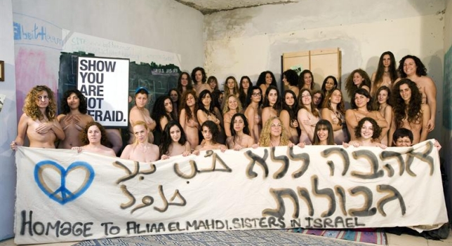Més de 100 dones van assegurar a Facebook que atendrien a la protesta però al final 50 valents es van despullar davant de la càmera al costat d’un càrtel que deia “Love Without Limits” (amor sense límits) i amb una pancarta en què es pot llegir “Homenatge a Allia Elmahdi. Germanes d’Israel”.