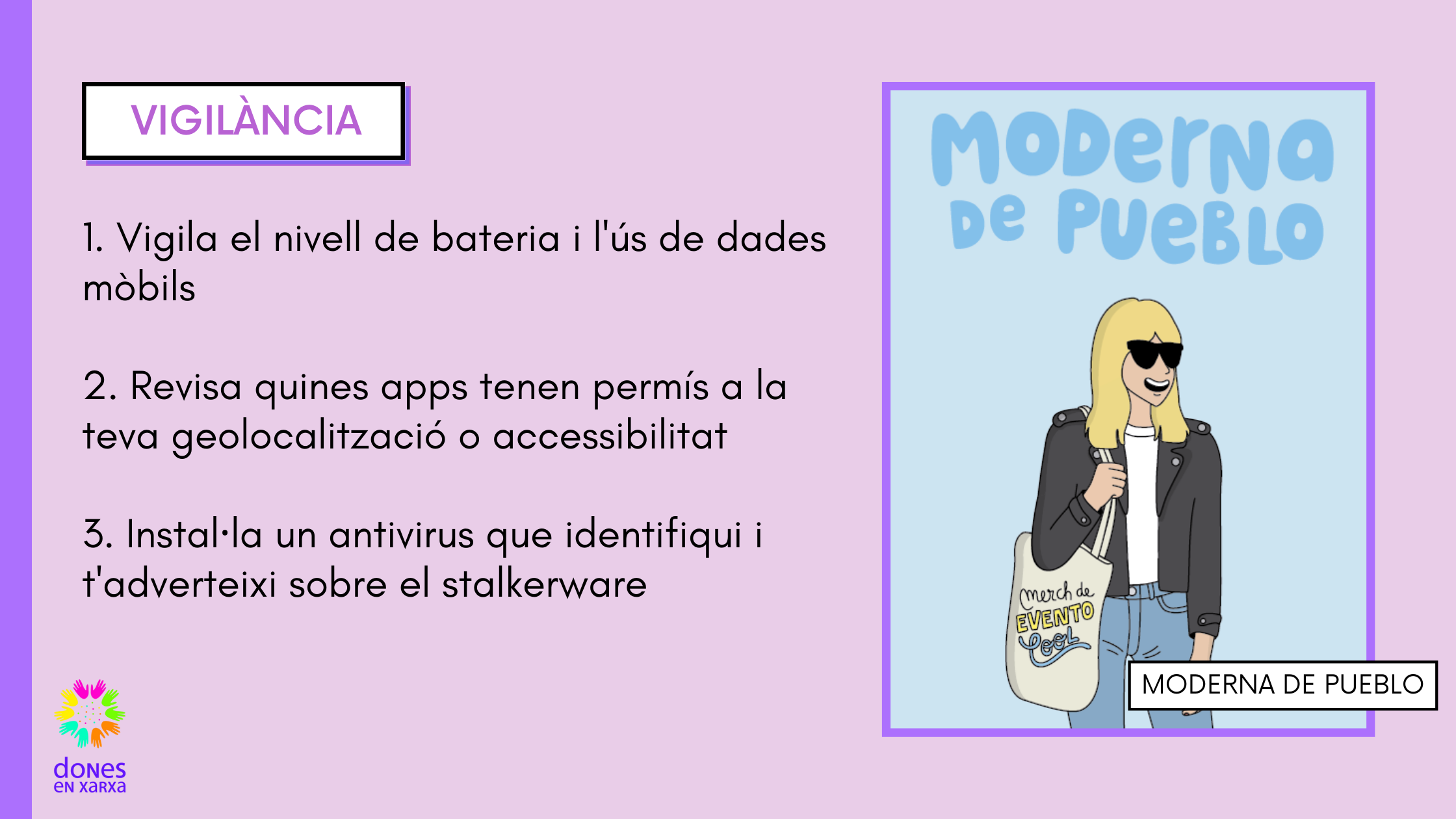 L’artista feminista Moderna de pueblo va fer unes vinyetes on explica la mena de funcions que pot tenir un stalkerware i com el seu ús a més de ser per si mateix un acte de violència masclista, pot conduir a d’altres tipus de violències i al control de les dones per part de la parella. I aquests son els consells que ens dona per detectar si estem sent víctimes d’un stalkerware: