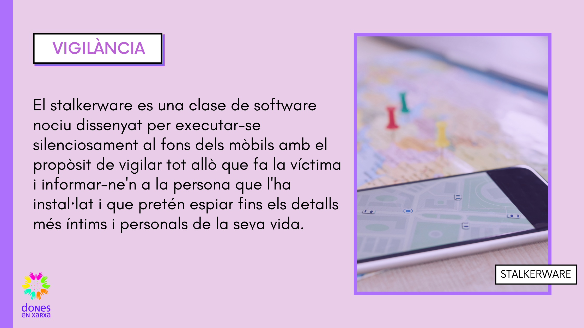 El stalkerware és una clase de software nociu dissenyat per executar-se silenciosament al fons dels telèfons intel·ligents amb el propòsit de vigilar tot allò que fa la víctima i informar-ne’n a la persona que l’ha instal·lat i pretén espiar fins els detalls més íntims i personals de la seva vida.