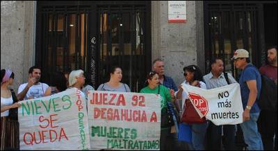 Una trentena de membres de la Plataforma d’Afectats per la Hipoteca (PAH) han protestat aquest dimarts davant el Jutjat Mercantil número 1 de Madrid per l’imminent desnonament de Neus Gómez Ruiz. Segons ha defensat la mateixa afectada, el proper 3 de juliol haurà d’abandonar el pis que va contribuir a pagar i en el qual viu des de fa més de deu anys – carrer Doctor Vallejo Nájera-amb els seus dos fills, ja que l’immoble es troba a nom dels seus sogres, els pares de l’home contra el qual Neus ha presentat dues denúncies per maltractament.