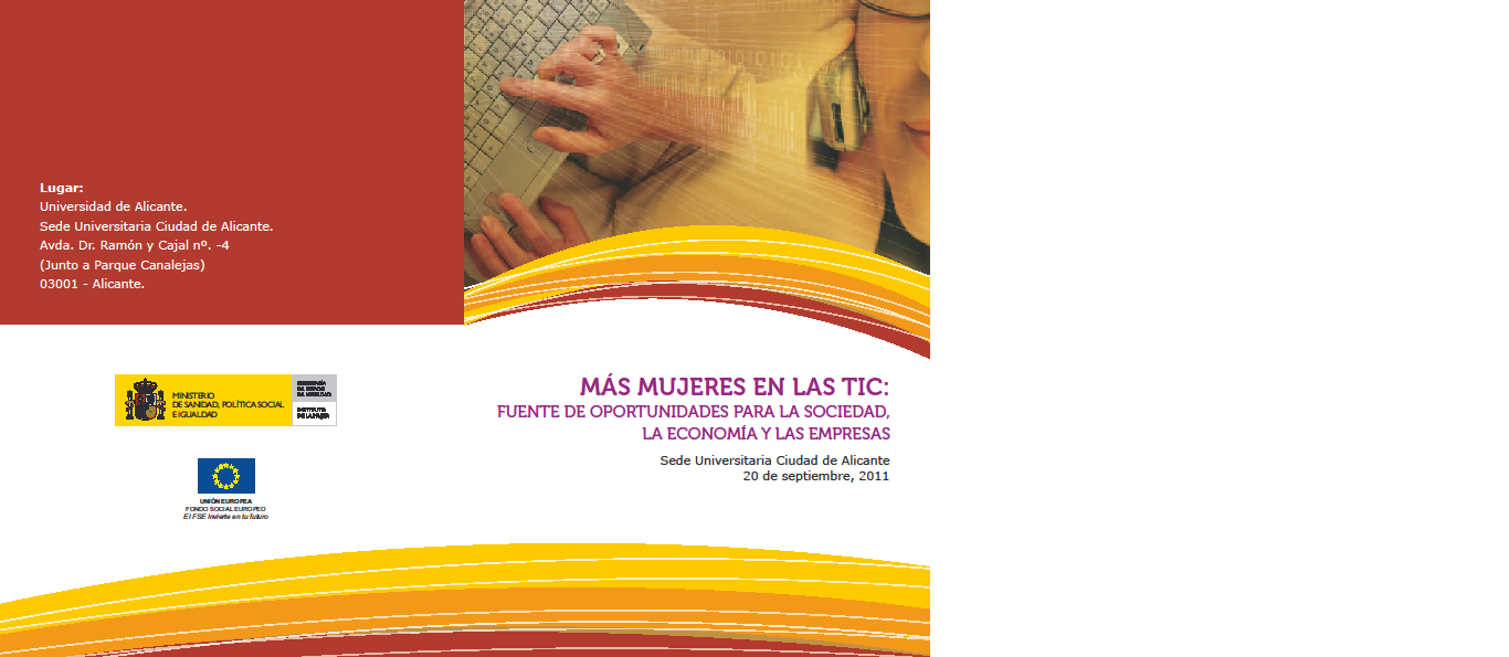 Con el subtítulo ‘fuente de oportunidades para la sociedad, la economía y las empresas’, el Instituto de la mujer organiza el seminario Más mujeres en las TIC en la Sede Universitaria Ciudad de Alicante el próximo martes 20 de septiembre. El encuentro está destinado a promover el uso de las Tecnologías de la Información y la Comunicación entre las mujeres y evitar así otro posible foco de desigualdad de género. En este caso se analiza su implicación en el ámbito de la empresa.
